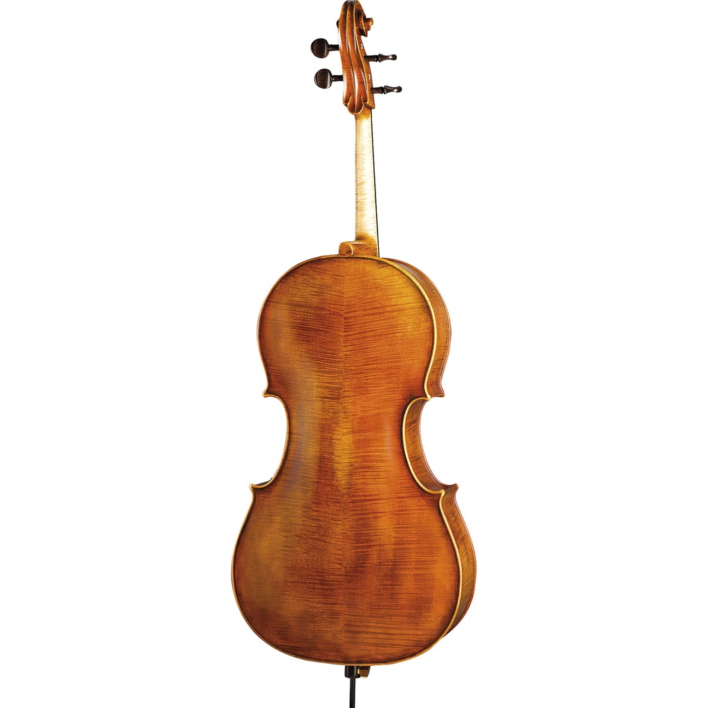 Handcrafted Master cello crafted using nicely flamed maple with genuine purfling and orange-brown antique hand varnish on amber primer.