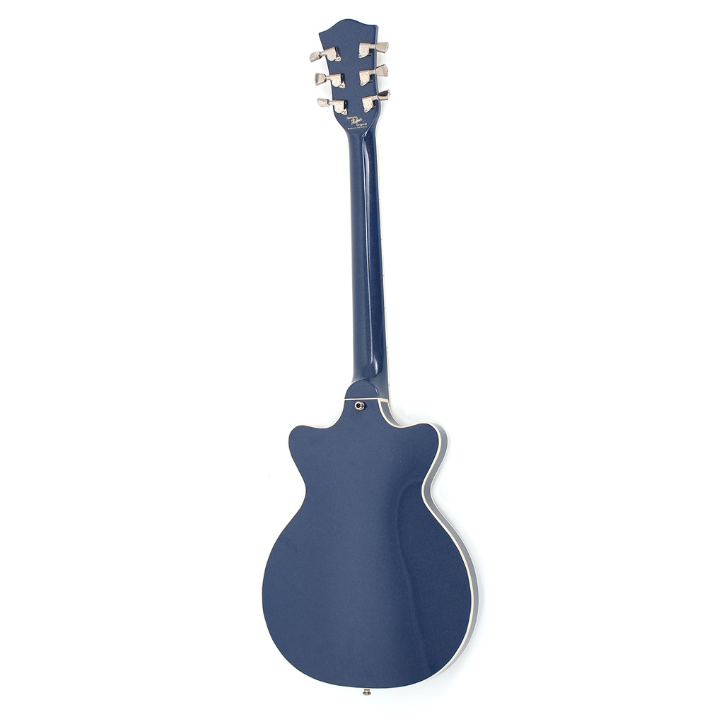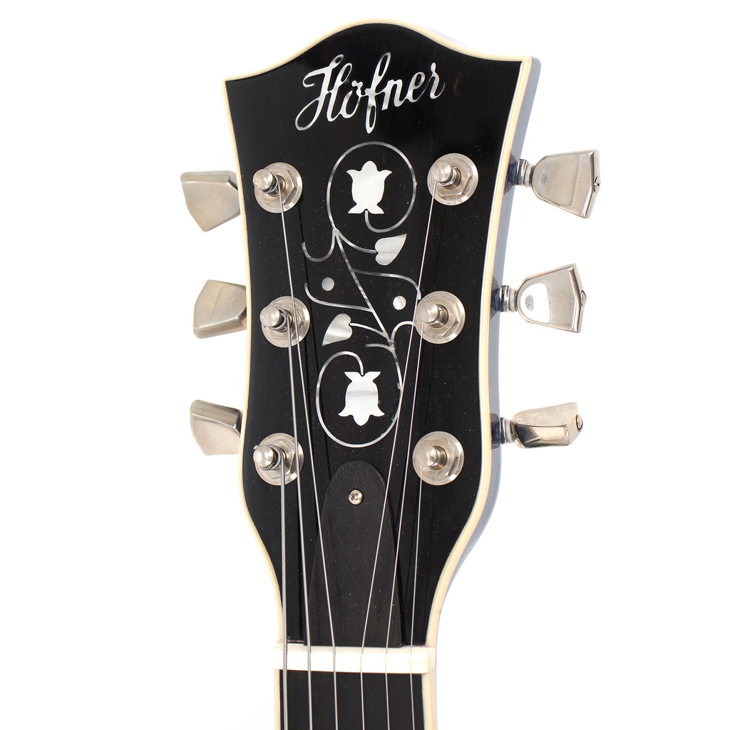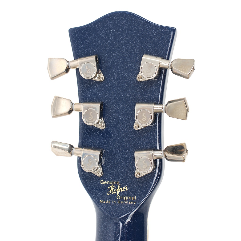 The headstock shape of the Professional is part of the Höfner heritage as it is taken from our guitars made since the 1950s. With the traditional Höfner "Script and Lily" we are proud of it! The fingerboard is of ebony, so there are no problems with CITES certification as none is required, and incorporates double dot markers only at the 12th fret. Simple yet beautiful. The neck and the body are bound for additional good looks. The body has a spruce top and spruce back and sides, with a deep blue and very subtle silver sparkle lacquer finish.