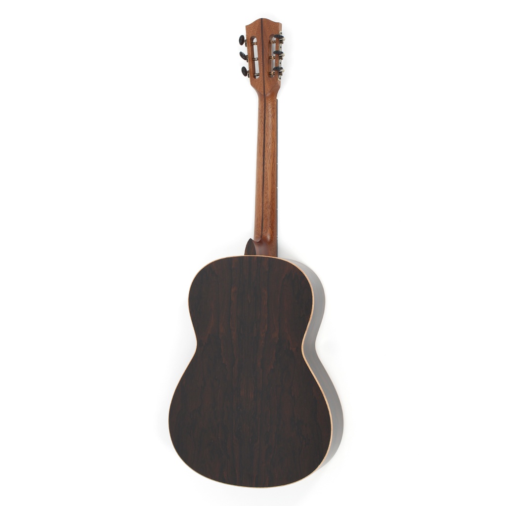 The perfect synthesis of simplicity and luxury is achieved with the outstanding combination of a carefully selected cedar top with a body made from breathtaking laurel wood. The timber for the fingerboard is a selection of fine and very old ebony. The neck, back and sides employ a sturdy satin varnish whereas the top is sealed with a wafer-thin finish from natural resins. The active pickup system is fitted without any opening in the sides to preserve the subtle and natural aesthetics and the tone of the instrument.