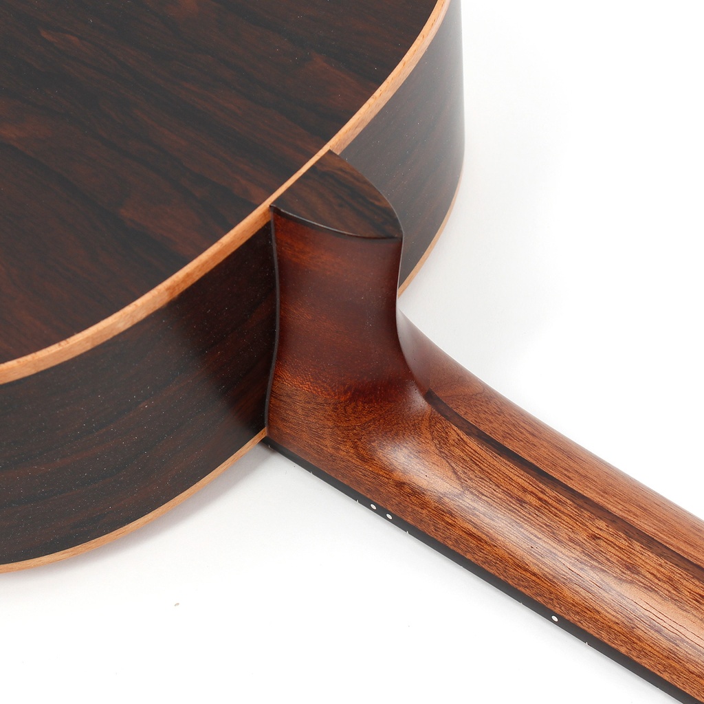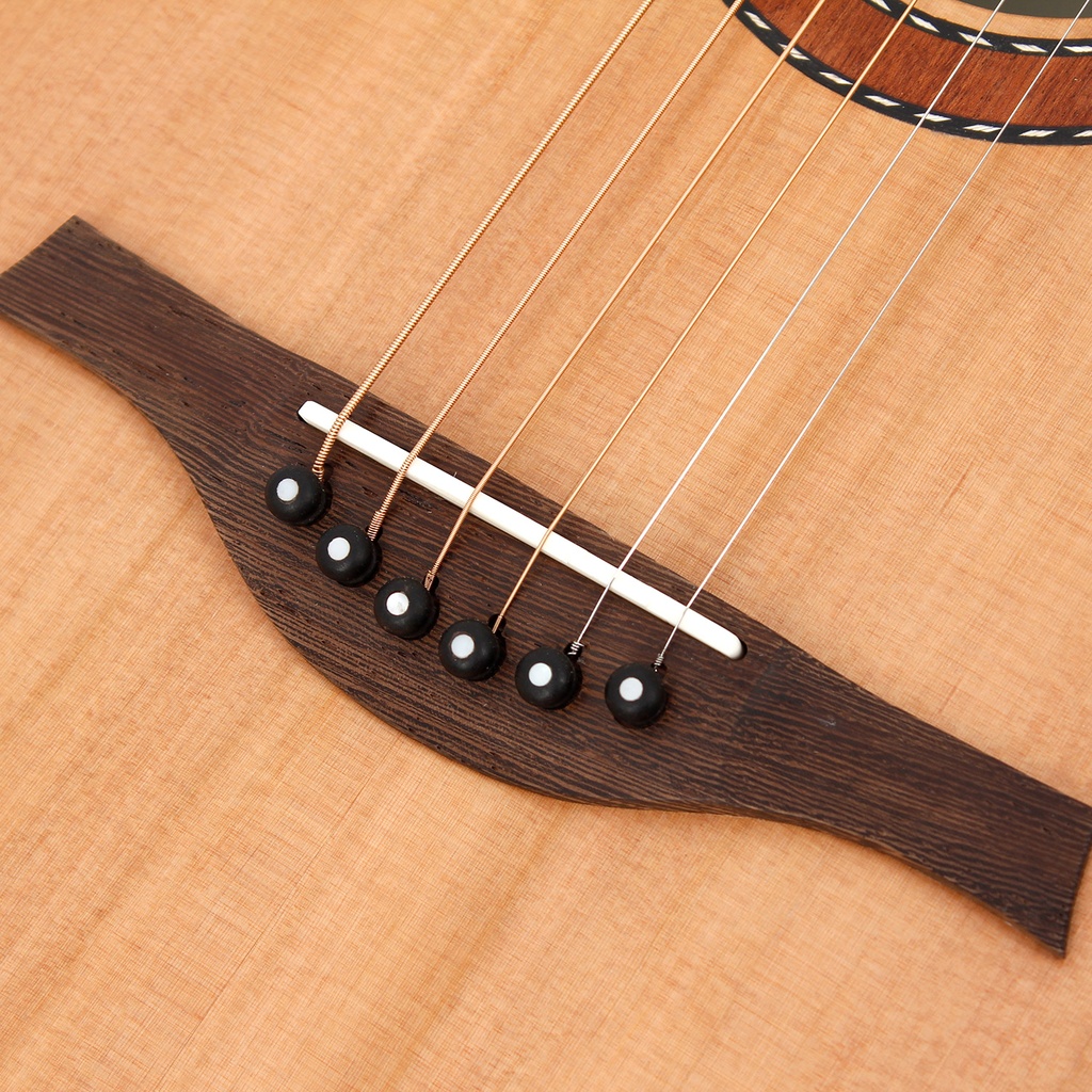 The smaller body shape of the CS28, plus the neck design with slotted headstock, refer to both the look and sound of a classic vintage acoustic from the 1930s, heard on many famous early recordings. The body and top project the sound prominently, making this one of the loudest acoustics available. The dark woody bass tones run under the shining highs, all of which are clearly audible throughout the tonal range. With a nut width of 45mm the guitar is ideal for finger picking and strumming; the neck width and shape is designed to melt into every player’s hand.