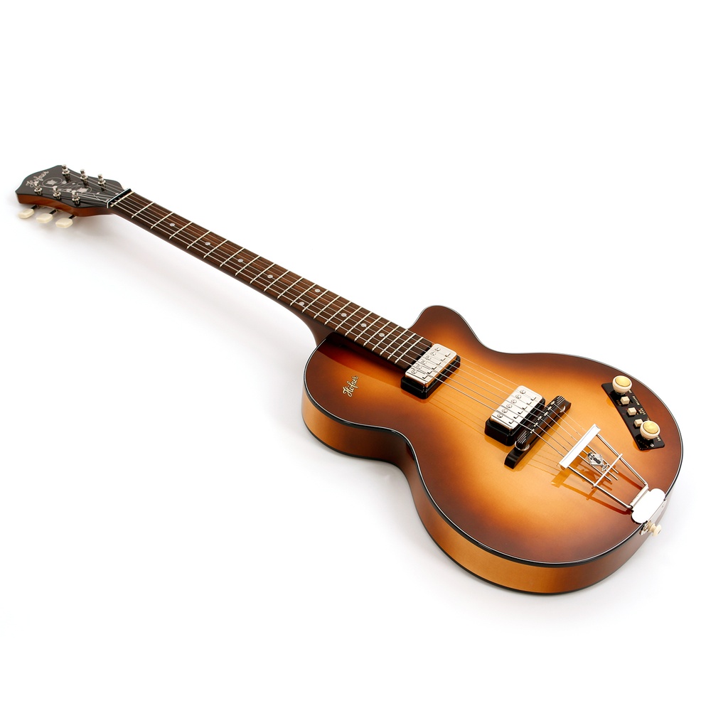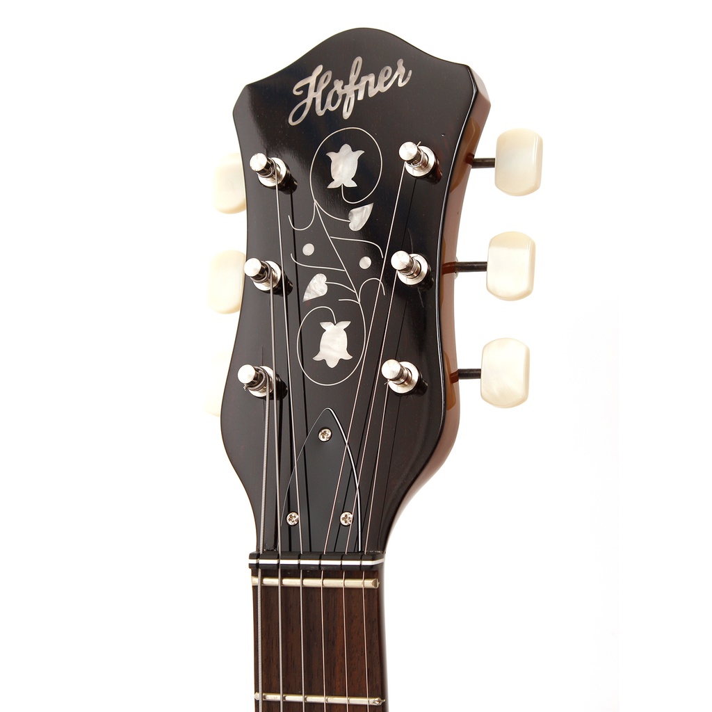 A re-creation of the best selling Hofner Club guitars as played in the fifties and sixties by some of the most influencial rock guitarists and numerous groups of the time. Fitted with two original Hofner "Staple" pickups as used in the 1960s, the classic Hofner control panel in tortoiseshell, black binding with narrow white stripe and  nickel hardware all complement the sunburst finish perfectly. The fully hollow body with arched spruce top and maple back delivers perfect noise free blues sound and vintage Hofner tones. A beautifully made master class guitar much sought after by enthusiast players and collectors.