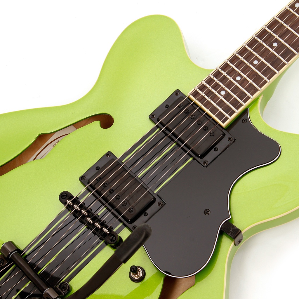 A limited edition of the famous Höfner Verythin guitar. Based on the original classic guitar body shape from 1960 with the body depth of only 1.25 inches the Hofner Verythin was extremely popular with groups during the 1960s beat boom era. This special edition is finished in Metallic Green with black hardware, features a genuine Bigsby vibrato unit and has dot fret position markers. The Hofner Verythin CT not only captures that unique 60s sound but also has the ability to produce tones ranging from deep gutsy blues through to cutting distorted rock. At Hofner we achieve this by fitting a centre block in the body to produce more sustain, deeper tones and less feedback.