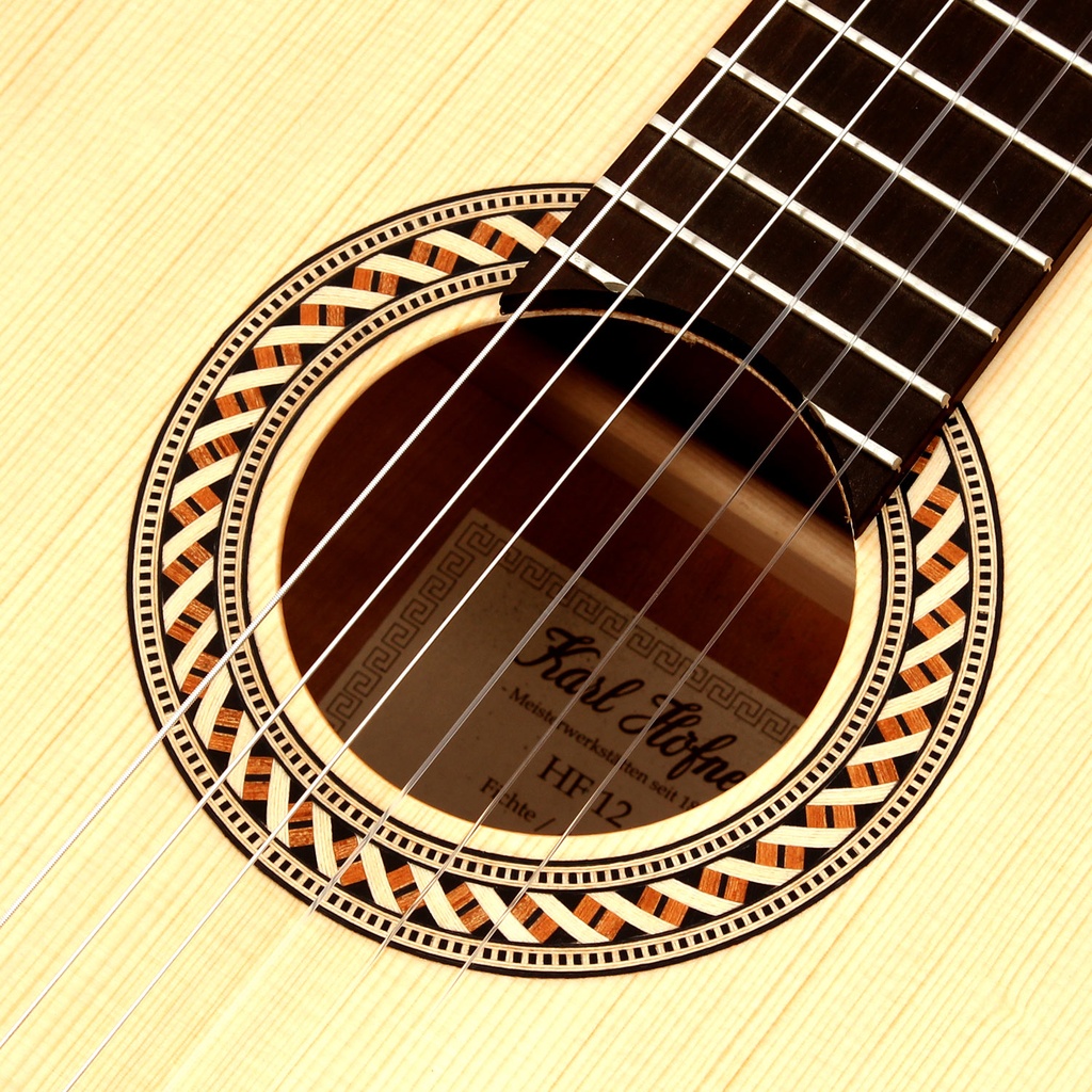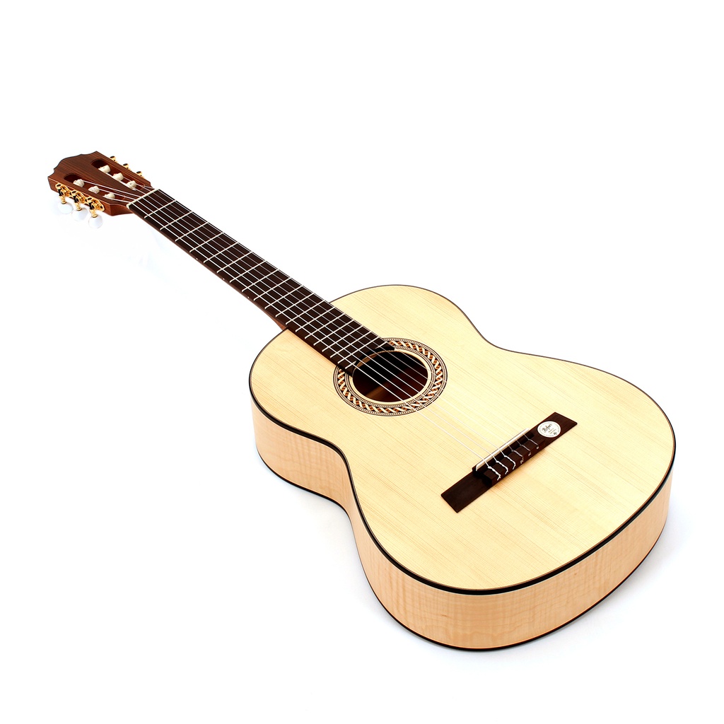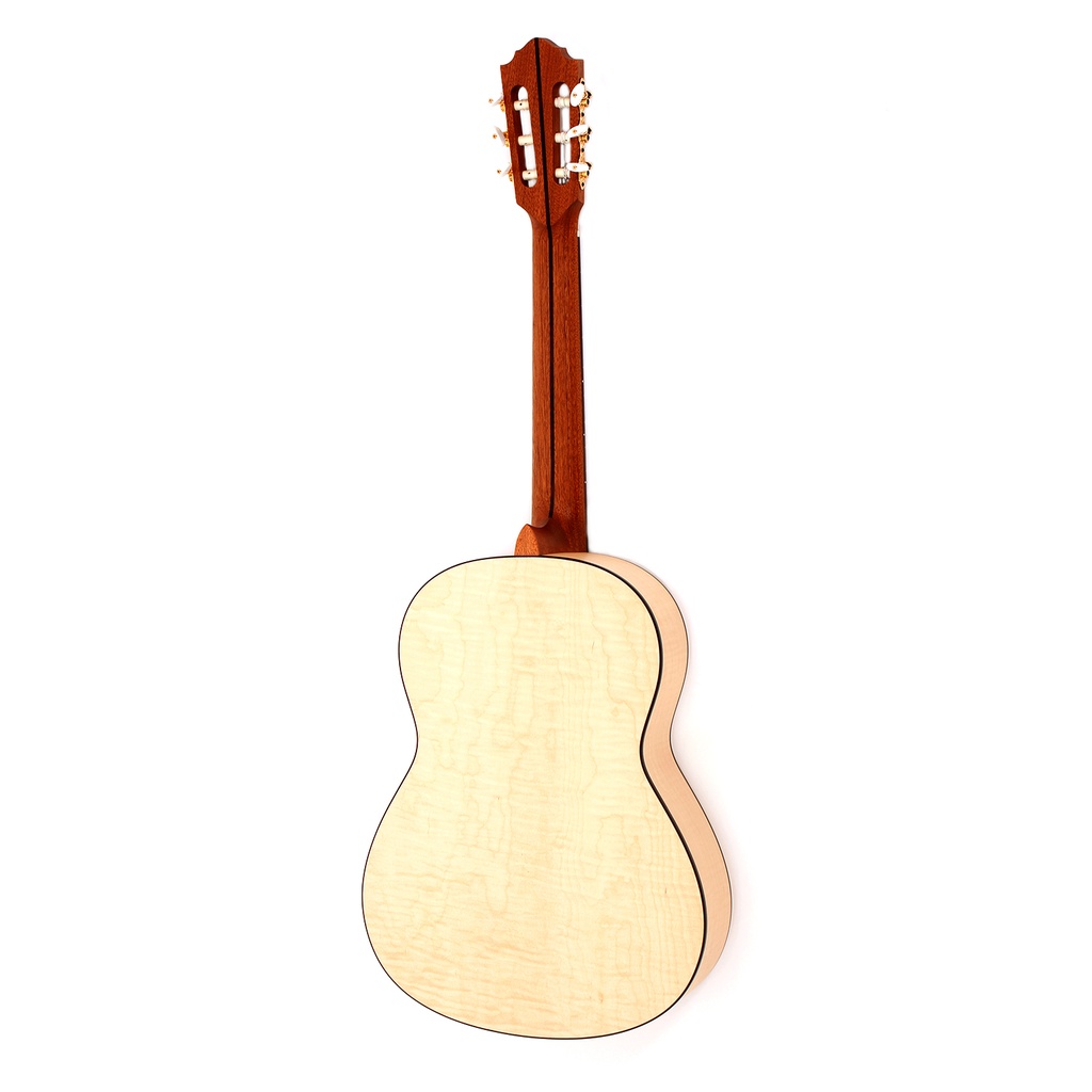 From its distinctive ribboned rosette around the soundhole to its light blonde solid spruce top, the pleasing appearance of the handmade HLE-AF is matched by its superior tone. Finished in matt, the back and sides are created from flamed hard maple. The mahogany neck with rosewood fingerboard ensures a level of playability one would expect from an instrument of this quality. The bridge saddle is made of bone to guarantee perfect string energy transmission, and the instrument has a 65cm scale with a 50mm nut width.