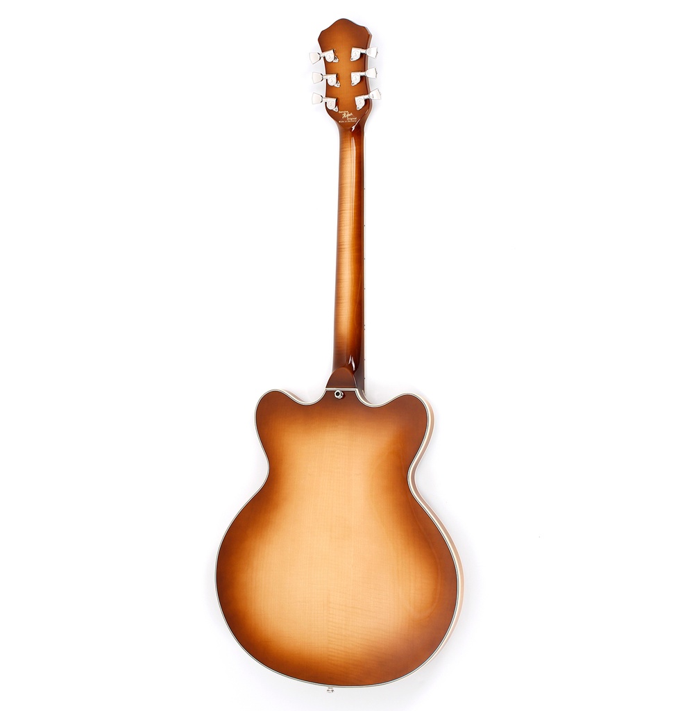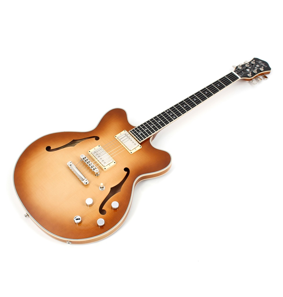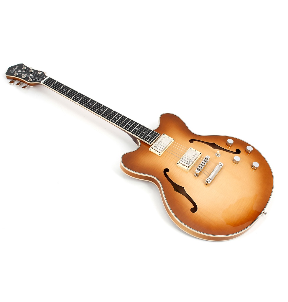 The super thin body is lightweight and extremely comfortable to play. The Standard model features flame maple top, back and sides, a sold spruce centre block for less feedback and good sustain, twin Höfner humbucking pickups for a wide and powerful tone output. The pickups are connected to twin volume and twin tone controls, while there is a tunamatic bridge with a stop tailpiece.