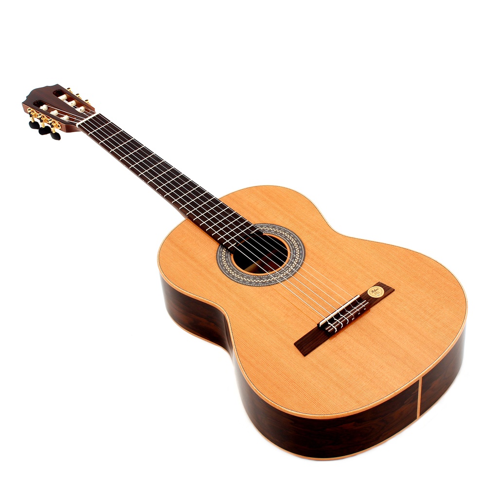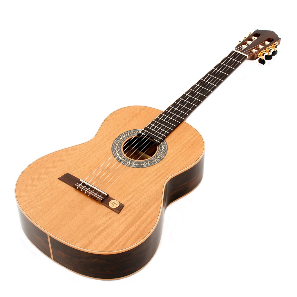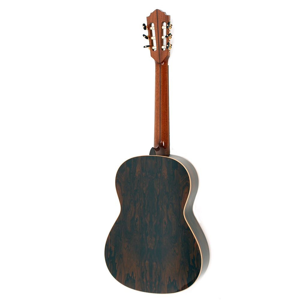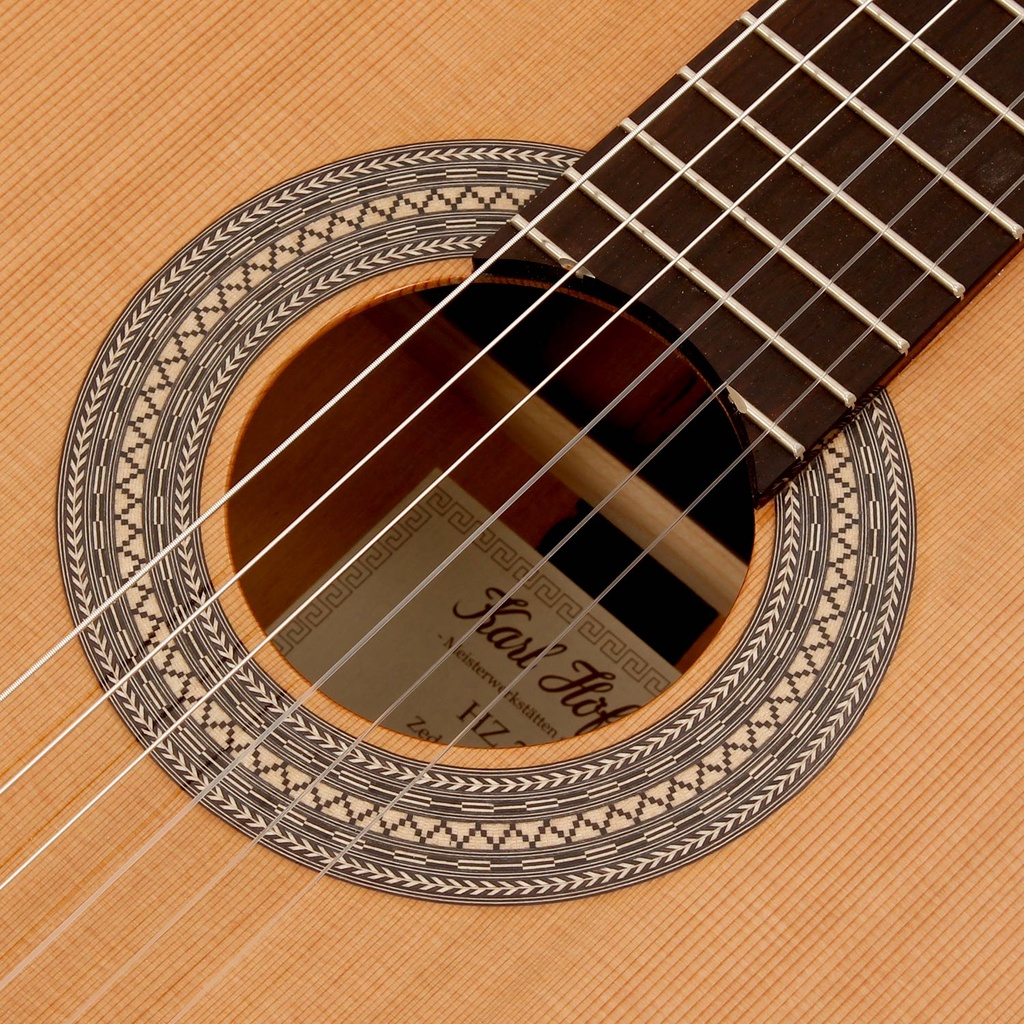 This beautiful Höfner classical guitar has a laurel body with a highly figured grain. The cedar top provides explosive dynamics and a delicate responsiveness. All the inlays and the bridge are crafted from high-grade tonewoods. This classical guitar also has high-quality cast brass machine heads. Wood, being a natural product, can produce a different appearance in each and every instrument, thereby giving each owner a distinctive and unique instrument. The play of colours can range from nearly black over chocolate to a deep and lustrous gold.